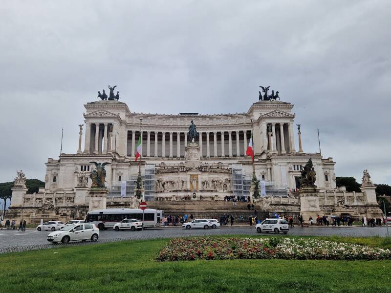 Nadat we er een heerlijke lunch hebben gehad, verlaten we de Joodse wijk voor de verdere wandeling deze dag. Wel is het deze middag soms een beetje wisselvallig met wat regen en zon. Na een flinke wandeling en klein stukje met de bus, komen we aan op Piazza Venezia. Op dit centrale plein komen de 4 belangrijkste wegen van Rome samen. Dit zorgt soms voor veel drukte van toeristen en verkeer die elkaar kruisen. Zeker de moeite waard om te bezoeken, maar wees voorzichtig bij het oversteken in alle chaos die hier lijkt te zijn.
